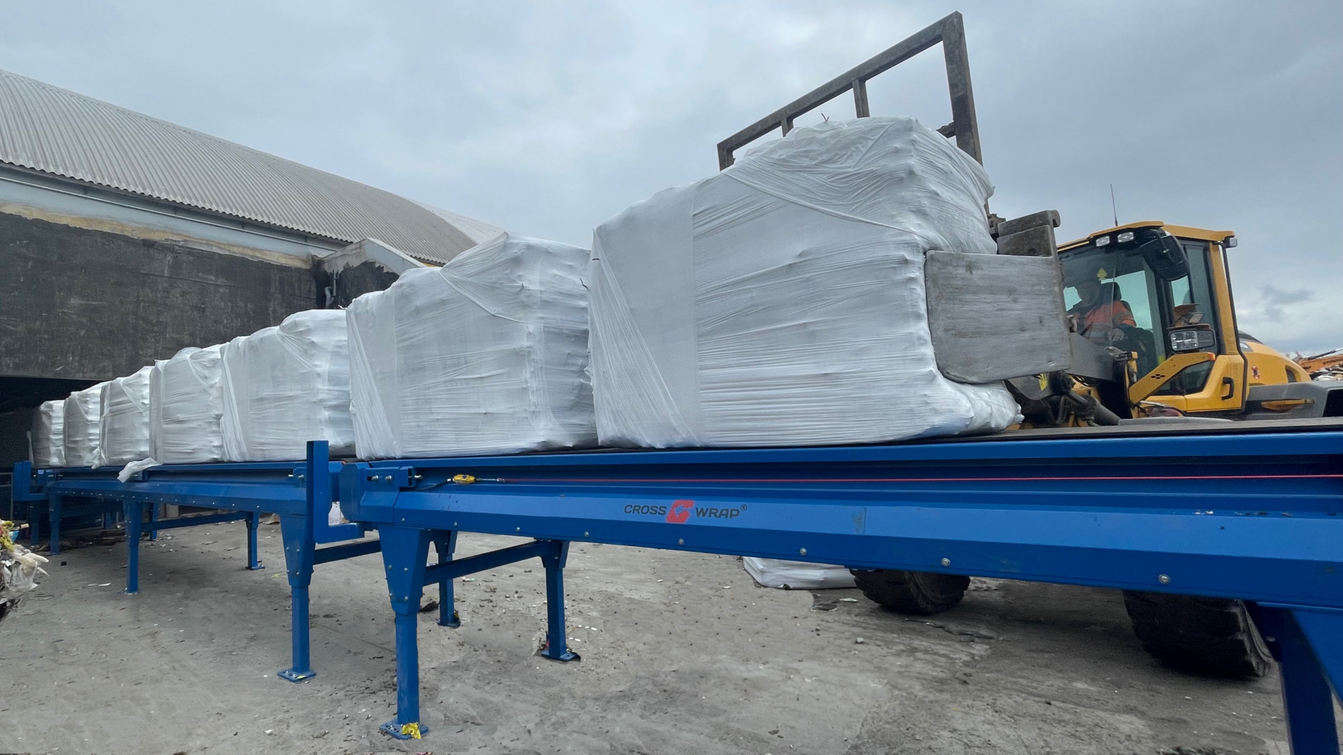 Home > Technology Zones > Material Handling Technology > Expert Insight: Cross Wrap offers proven baled material handling systems for Waste management and Recyclers  > Wrapped bales on conveyor