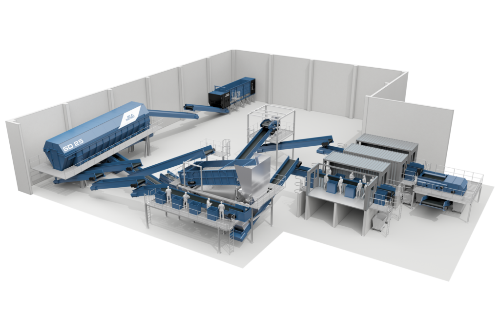 Many of the system solutions presented are modules and processing lines that can be integrated into larger processes. This applies in particular to the frontends. These small systems are available with a pre-shredder, a bag opener or bale dewirer and can be ordered either with an additional conveyor belt or directly with an overbelt magnet, rotary loading for double-sided container filling and various screening systems, depending on requirements. On the other hand, some processing lines are offered with different throughput rates and can be set up parallel to one another as needed. “This principle is common practice nowadays, especially with large systems, as it has a positive effect on plant availability – after all, only one line is shut down during servicing or maintenance work and not the entire system. Scalability was therefore very important to us.” For example, plant sizes of 150, 250, 500 and 1,000 t of municipal solid waste (MSW) treatment capacity per day are available for biological drying with the CONVAERO system or refuse-derived fuel (RDF) production with the Eggersmann FUEL process. “As in a construction kit, throughput volumes such as 650 or 1,250 t can be put together on a modular basis.”