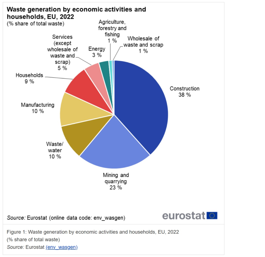 In 2020, the EU generated around 2,153 million tonnes of waste, with construction and demolition activities contributing the largest share at 37% (Eurostat). This underlines the ongoing challenge of effectively managing C&D waste, especially given the continued renewal and renovation of Europe’s ageing infrastructure. Mining and quarrying accounted for 23% of total waste, emphasizing the significant environmental implications of extractive industries.